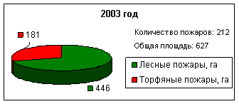 лесных пожаров составляет 41713,27 га, площадь торфяных 14556 га. Общая площадь выгоревшего лесного фонда составляет 56269,27 га.