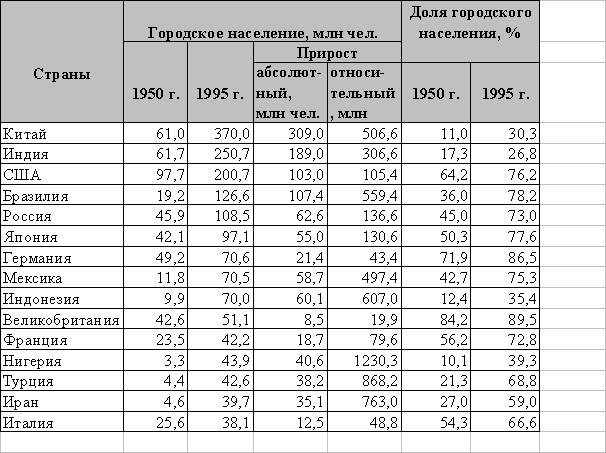 1950-1990 гг. численность городского населения мира выросла почти в 3,1 раза и