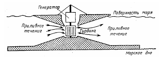 Разность уровней воды в море и бассейне обеспечивает работу гидротурбин. При
