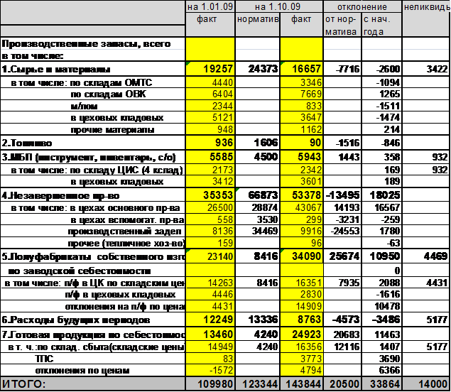 целом на 1.10.09г. запас НЗП в цехах не превышает норматив : норматив 66,9 млн.