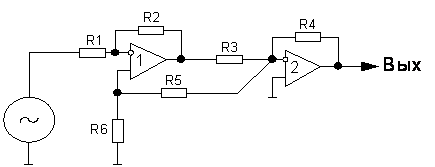 реализуется передаточная функция звена полосового типа, а на выходе второго ОУ