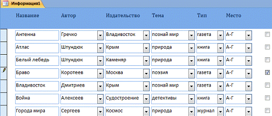 [Читатель, книги]. [Form]! [kod_chitat]) AND ((Информация.nazvan)=[Forms]! [Информация1]!