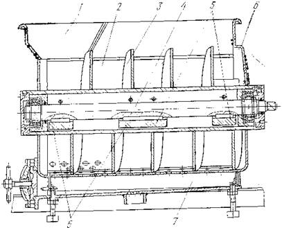 загрузочный бункер; 2 – рабочая камера; 3 – шнек; 4 – приводной вал; 5 – грузы
