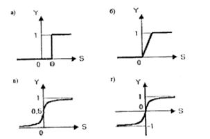 единичного скачка; б) линейный порог (гистерезис); в) сигмоид (логистическая