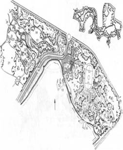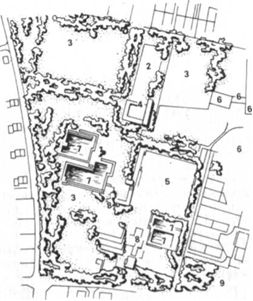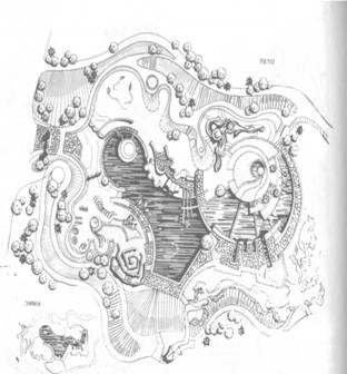 приемами геопластики) — холмы, долины, водоемы, насаждения, а также необходимые