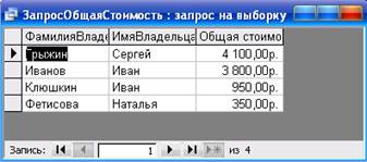 Имя Владельца, SUM( Стоимость Работы+Стоимость Запчасти) AS [Общая стоимость]