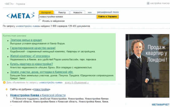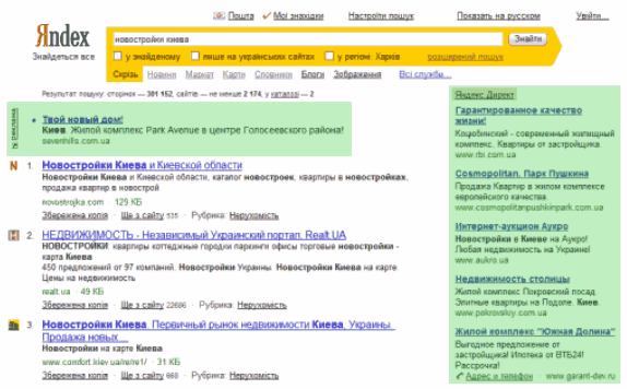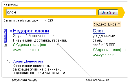 розташування контекстної реклами на сторінці пошукового серверу Яндекс