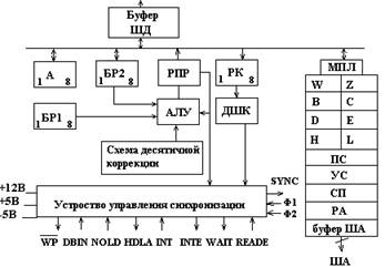 микропрограммное устройство управления. Тактовая частота составляет 5-8 МГц.
