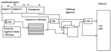 Линейный адрес содержит 3 поля. Индексы по 10 бит и