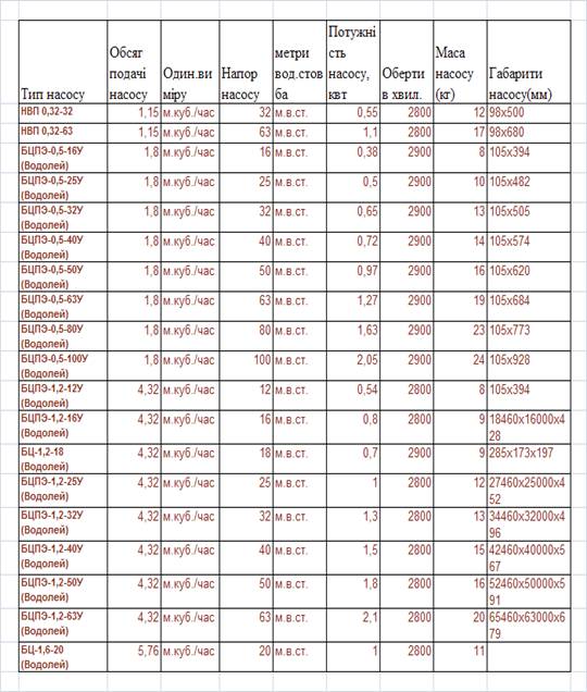 характеристики скважинних електронасосів та конкуруючих видів побутових
