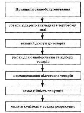 самообслуговування, продаж товарів з відкритим викладенням, за зразками, на