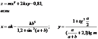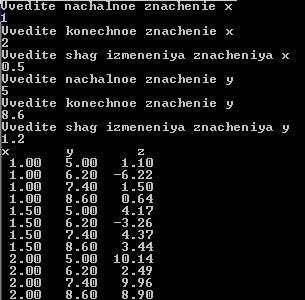 расчета значений функций двух переменных z=f(x,y) с использованием оператора цикла. Значение переменных x и y изменяются соответственно от xнач. до xкон. с шагом hx и от yнач. до yкон. с шагом hy и вводятся с клавиатуры. Указанные