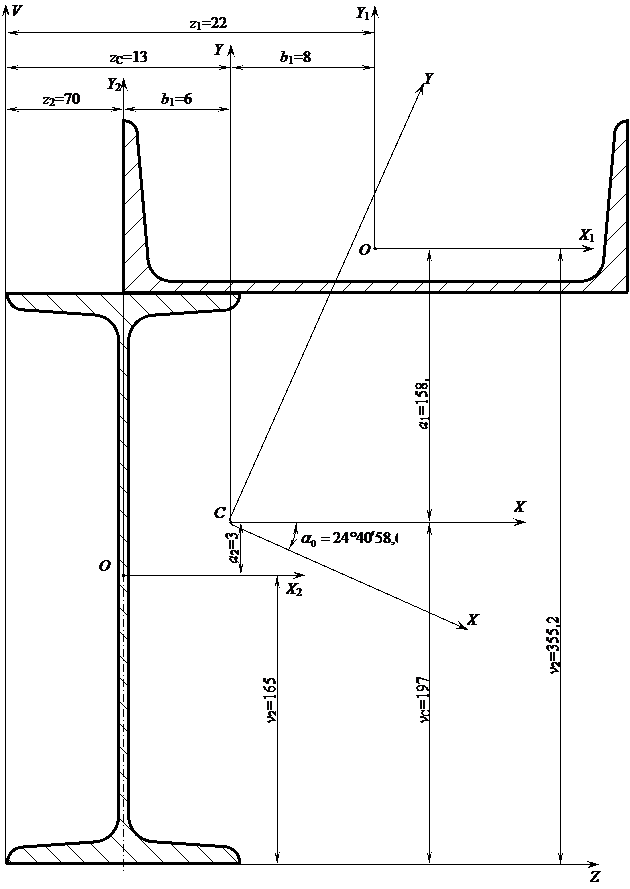 оси V, Z и определяем относительно их координаты центра тяжести