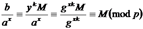 = gk (mod p), b = yk M (mod p), где M - исходное сообщение.