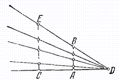 точки отрезка АВ приведены при помощи лучей, проходящих через точку D, во «взаимно однозначное» соответствие