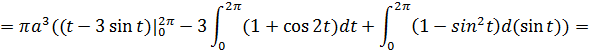 одной аркой циклоиды, уравнение которой задано параметрические x= a (t – sin t) , y= a (1 – cos t) , и осью Ох, сводится к следующему