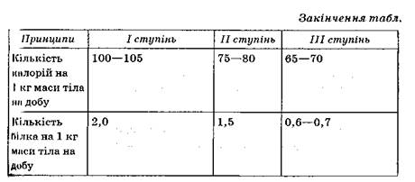 — 180—200 ккал на 1 кг маси тіла на добу. Білки становлять 10—15 % калоражу