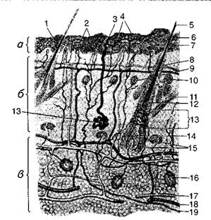 власне шкіра (дерма); в — підшкірна основа; 1, 5 — волос; 2 — сосочки власне