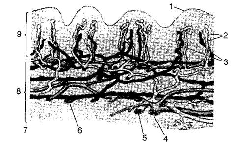 підшкірна основа (клітковина); 8 - глибокий (базальний) шар шкіри; 9 —