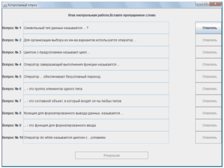 вопросы, становится доступной кнопка "Результат", по нажатию на