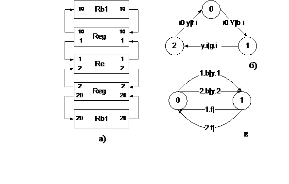 структура: а) топология; б) диаграмма регуляторов; в) диаграмма автомата,