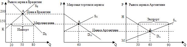 товар – зерно. Кривые предложения в Бразилии – Sб, в Аргентине – Sa (1 и 3 графики).