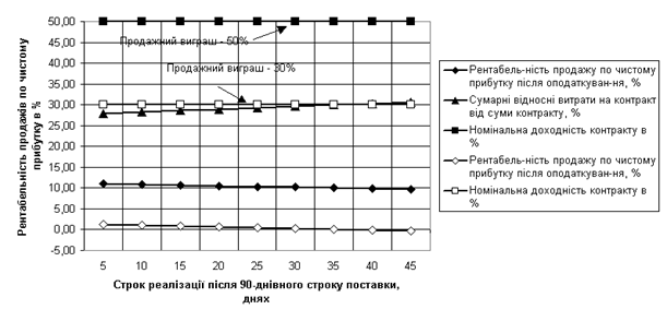 (90 днів) для варіантів продажної маржі в 50% та 30% від суми контракту