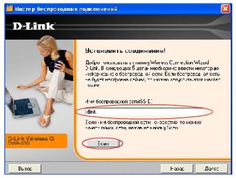 требуется указать имя беспроводной сети, в нашем случае это dlink, либо нажать
