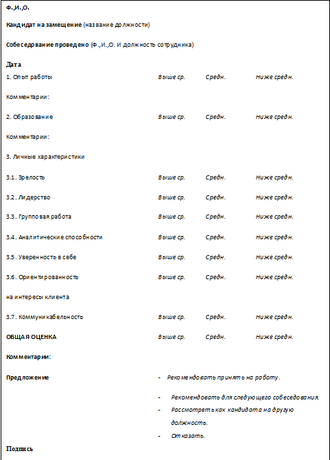 отбора кандидатов на замещение вакантного рабочего места