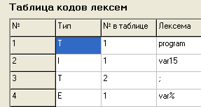 таблице'; StringGrid4. Cells [3,0]: ='Лексема'; // определение заголовков