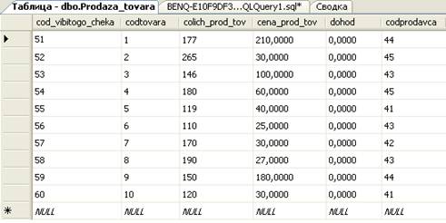 insert into Prodaza_tovara values (59, 9, 150, 180, 0,