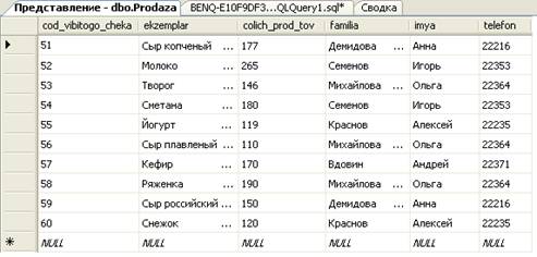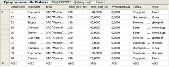 view Postavka as select Postavka_tovara.codpostavki, Tovar.ekzemplar, Postavsiki.firma,Postavka_tovara.colich_post_tov, Postavka_tovara.cena_post_tov, Postavka_tovara.symmapostavki, Manageri_postavok.familia, Manageri_postavok.imya from Postavka_tovara inner join Postavsiki on Postavka_tovara.codpostavsika = Postavsiki.codpostavsika inner join Tovar on Postavka_tovara.codtovara = Tovar.codtovara inner join Manageri_postavok on Manageri_postavok.cod_meng_postav = Postavka_tovara.cod_meng_postav