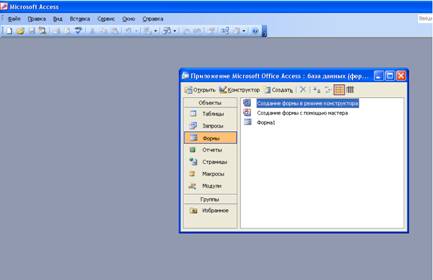«Базу данных». Далее мы создали ещё одну форму при помощи конструктора, где