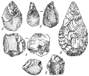 оббита галька із нижньочетвертичних відкладень ущелини Олдувей в Східній Африці (по Коулу); б — аббевільскі знаряддя із Англії (зліва|) і Марокко