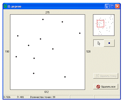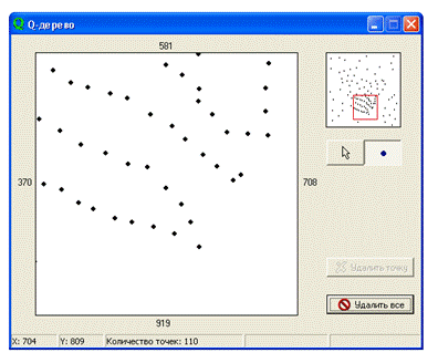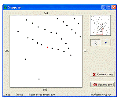 дерева и его перерисовка; уменьшение количества точек в дереве на единицу.