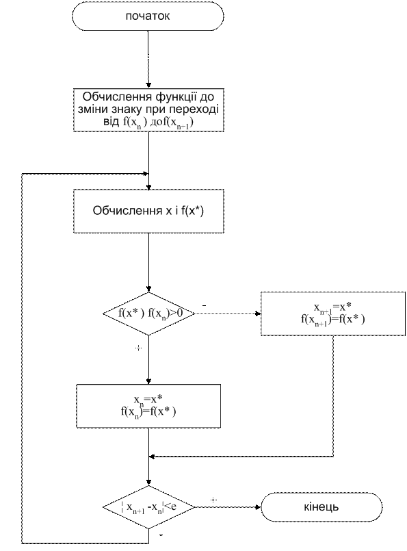 . Якщо ж f(xcp) має знак, протилежний f(xn), тобто збігається зі знаком f(xn+1), то на хср замінюється xn+1 . За умову припинення
