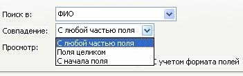 установленном как «С любой частью поля» можно будет ввести часть фамилии, и