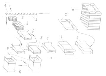 укладчик (поз. 3). П’ять пачок заходять на прийомну площадку і перша пачка