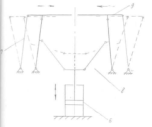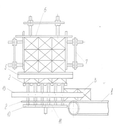 верхнього 5 штовхачів, що перештовхують однорядний штабель на стіл 8 касети