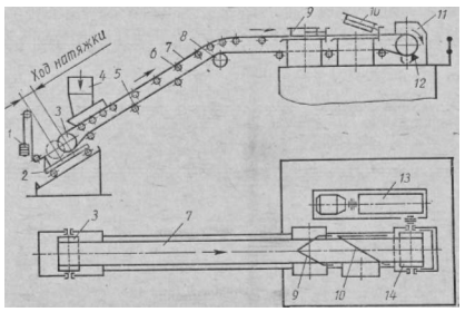 тяговым органом 6 конвейера. Для натяжения тягового органа конвейерана раме с