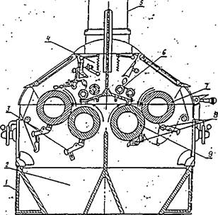 питающие валики, 7 - быстро вращающийся валок, 8 - ножи для очистки, 9 - медленно