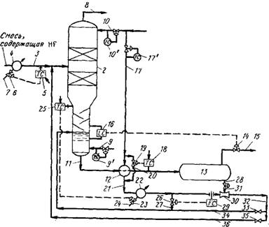 качестве флегмы в отпарную колонну по линии 19, а частично — по линии 20 в колонну для выделения HF 21. Кислотная фракция 22 рециркулируется по линии 23 в верхнюючасть отстойника 7. Отпарная колонна и колонна для выделения HF