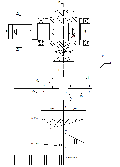равной длине полумуфты l= 82 мм, получим изгибающий момент в сечении Д-Д от консольной нагрузки