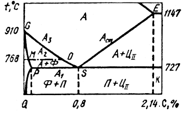 2. Вычертите участок диаграммы Fe-Fe3C для стали и нанесите на нем линии
