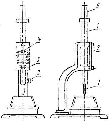 металевий стрижень; 2 - обойма станіни; 3 - стопорний пристрій; 4 - покажчик; 5