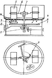 При вращении вертикального вала 1 катки 5, установленные на подшипниках на