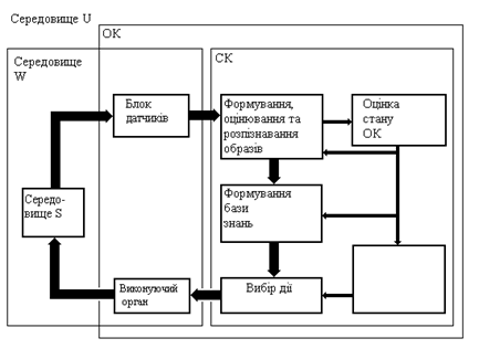 На рис.5 подана система, під якою будемо розуміти середовище, у яке вкладений ОК, що містить у свою чергу КС. Як бачимо з малюнку, можна стверджувати, що КС управляє не тільки ОК, але й всією системою. Під середовищем у системі можна розуміти різні об'єднання об'єктів. Будемо називати середовищем W сукупність об'єктів, що лежать поза КС; середовищем S - сукупність об'єктів, що лежать поза ОК; середовищем U - всю систему.[5]