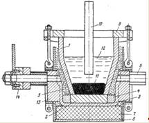 корпус; 9—чугунное кольцо; 10—графитовый анод; 11—расплавленный мишметалл; 12—расплавленный