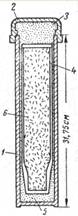 2—графитовый поддон; 3—чугунный тигель; 4—графитовая набивка; 5—набивка из