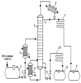 -1ёмкость для исходной смеси; 2, 9- насосы; 3- теплообменник-подогреватель;